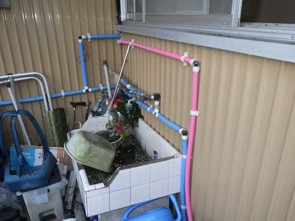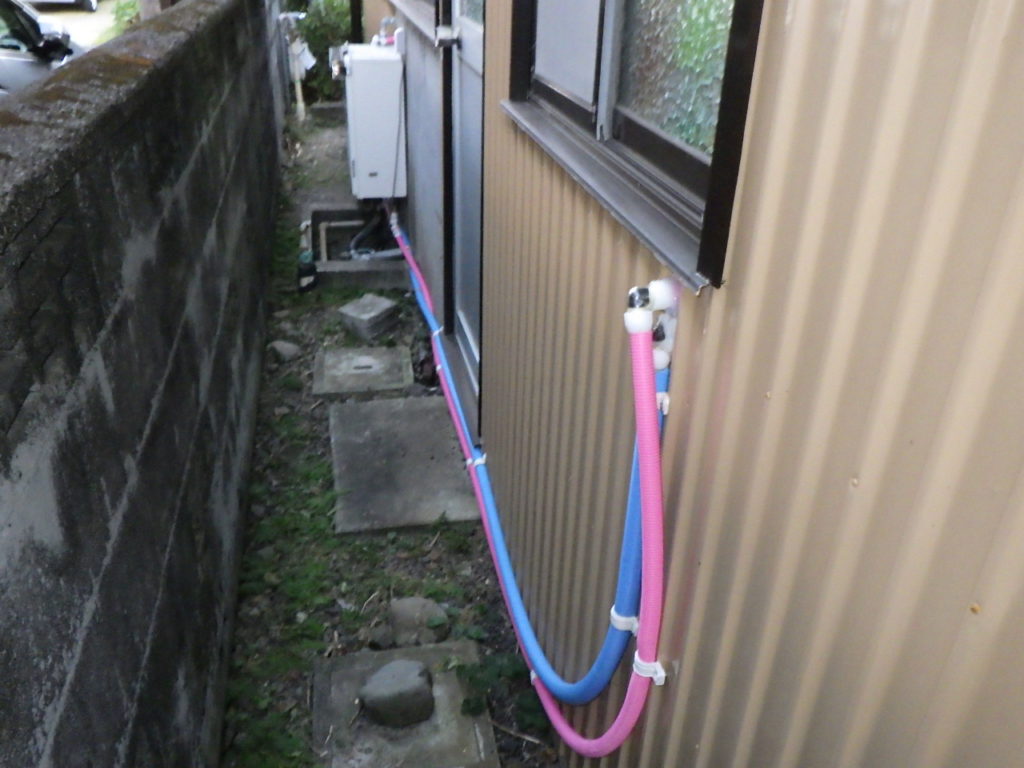 某ガス屋様のご紹介で、W様邸の給湯管の漏水修理(配管やりかえ)を行わせていただきました。 ※給水(ブルー配管)は以前に別の水道屋さんが工事。※給湯(ピンク配管)を今回弊社が工事。 漏水していて困っているとのことでお尋ねしてみると、給湯管から漏水していました。銅管でもなく白管で給湯配管をしてあり、1箇所直しても直らない可能性が大なため、今回給湯配管をやりかえました。 W様のご要望でなるべくお金をかけたくないとのことでしたので、以前工事した水道屋さん同様に露出配管で化粧テープや化粧カバー等の保護なしで工事させていただきました。 ※正直、水道屋としてはキャンパステープぐらい巻きたかったですが・・・(≧▽≦) 漏水も無事に直り、W様には『迅速に対応していただき、そして安く工事してくれて本当にありがとう!!』と大変喜んでいただきました。 W様、今後もお困りの事がございましたら、お気軽にご相談ください。 某ガス屋様、ご紹介いただきありがとうございました。 弊社ではお客様のご希望の施工方法やご希望の予算に応じて対応させていただきますので、安心してご依頼下さい(^^♪
