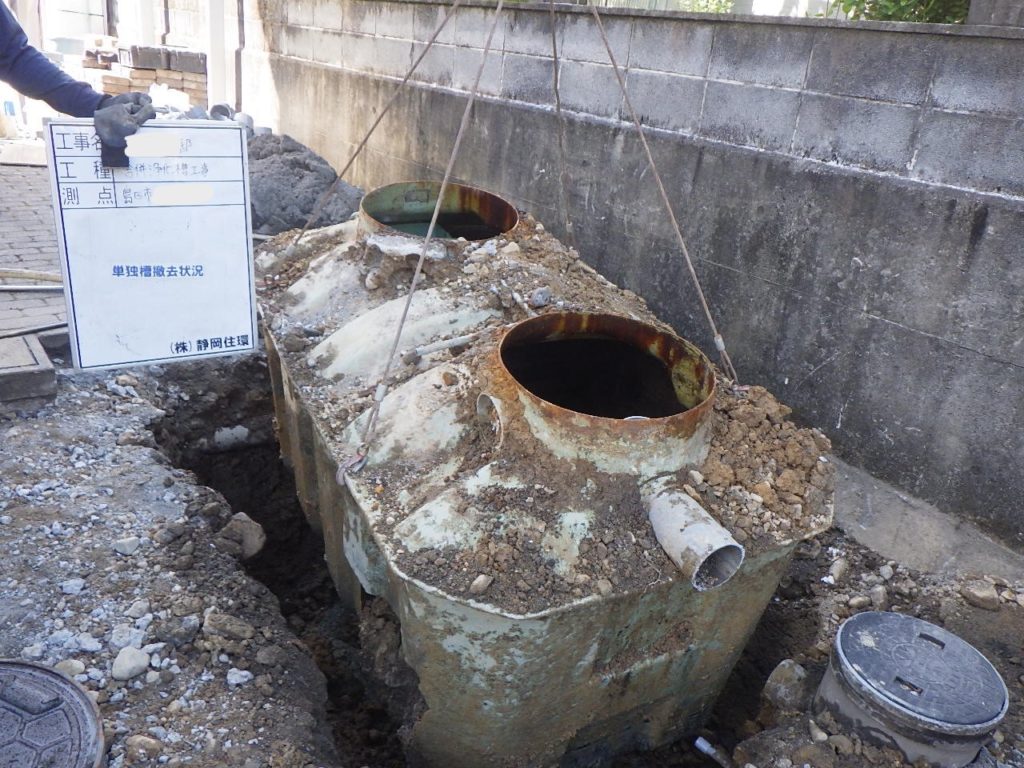 ★まだ工事していないあるお客様からご指摘がありましたので、こちらにもきちんとUPさせていただきます。単独槽の撤去ですが、弊社では9割程の割合で上記写真のように『抜き取り方式』できれいに撤去させていただいております。ごくまれに単独槽が住宅基礎の真横にあり全てを掘りおこすと危険な場合や、重機が侵入不可の場合に限り、『埋め殺し方式』で撤去させていただく場合もごくまれにあります。ここでお客様に分かっていただきたいのでが、『埋め殺し方式』でも業者によってやり方がかなり違います。悪質な業者様は単独槽の上部マンホール周辺のみを壊し、中の濾材等を一切取り除かないで砂や土で埋めてしまいます。弊社の『埋め殺し方式』はマンホール周辺だけではなく、中の濾材や各種装置/仕切板全てをきちんと取り除き、浄化槽の側のみをあえて残すやり方をしています。同じ『埋め殺し』と言っても全然違います。こうした単独槽の処分方法も静岡住環では毎度適切なやり方をしていることを市役所担当者様は分かってくれています。何故かと言いますと、全ての現場で立会検査もありますし、全ての現場の『撤去搬出写真』を毎度提出していますので。それでも弊社の処分方法に疑いを持つようでしたら『静岡住環はしっかりと撤去処分してますか?』って市役所の担当者様に直接聞いてみてください!!それとこちらかもハッキリと言わせていただきますが、弊社の施工方法に疑いを持つようでしたら弊社ではなくよその業者さんに頼んでいただいてくれて結構です!!私の性格上、『弊社を信用してくれてご依頼いただけるお客様のためには、精一杯良い工事をなるべく安く』って気持ちになりますが、『施工方法等でこちらに疑いの気持ちをもたれているお客様に、精一杯良い工事をなるべく安く』なんて私は思えませんので・・・。