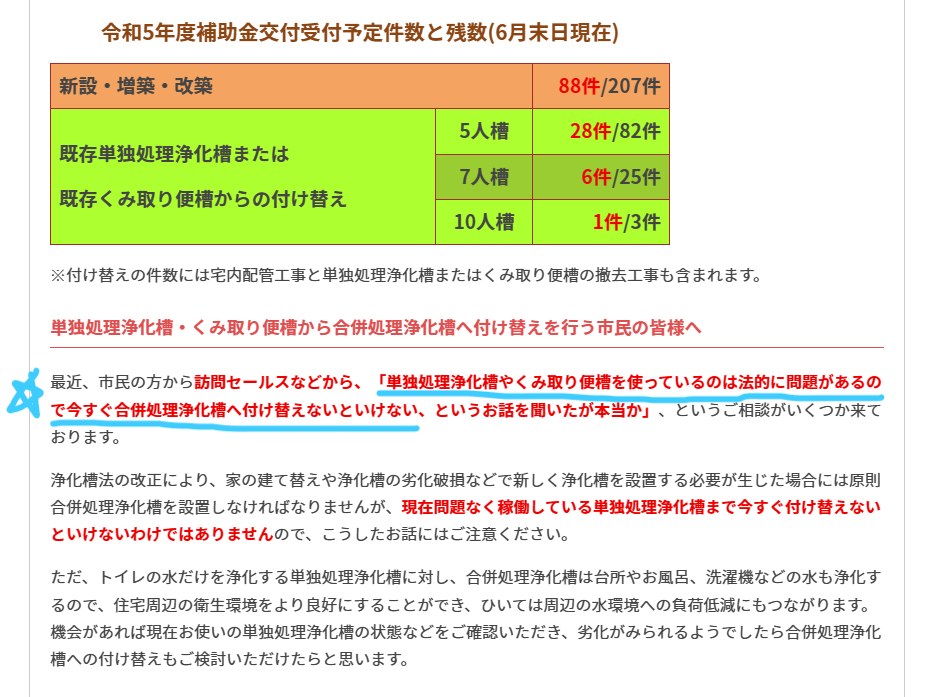 悲しい現実ですが、我々同業者の中にこういった会社が存在するのが実情です。単独浄化槽を合併浄化槽に転換することは、環境のためにもなるしお客様のためにもなるし確かに良いこと尽くめです。なので弊社も自信を持ってお客様にお薦めさせていただいております。しかし良い工事だからと言って虚偽や調子の良いことばかりを言ってお客様と工事の契約をすることは絶対にあってはならないですし、ハッキリ言ってそんなやり方は詐欺と一緒だと思います。弊社では、お客様に浄化槽転換工事のリアルとメリット/デメリットを正確に伝え、納得していただいたお客様のみ契約し工事を行わせていただいております。このブログを参考にしていただき、本当に浄化槽転換工事をした方が良いのか良くないのか、自分の判断だけではなく家族/友人/ご近所様にも相談してじっくりと考えて頂き、本当に納得した方のみ浄化槽転換工事を行うことをお薦めします。